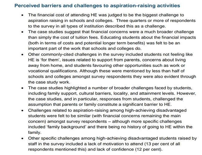 In 2014, the DofE carried out an investigation into School and College level strategies to Raise aspirations of high achieving disadvantaged pupils to pursue Higher Education.