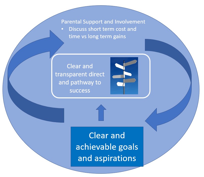 Provide children with opportunities to learn about an abundance of career opportunities; clearly set out the path that they will need to take to get there and involve families to facilitate the discussions of long term benefits vs short term cost and time.